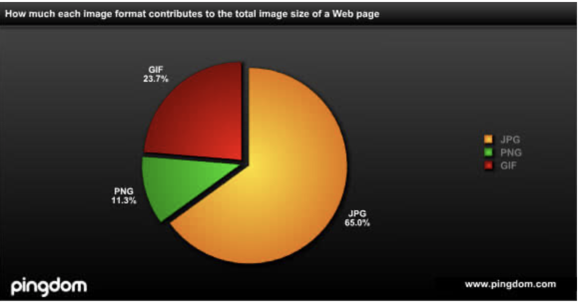 JPEG是网络图像的王者。 网络上绝大多数的图像以JPEG格式存储,具体的份额可以参考下图: