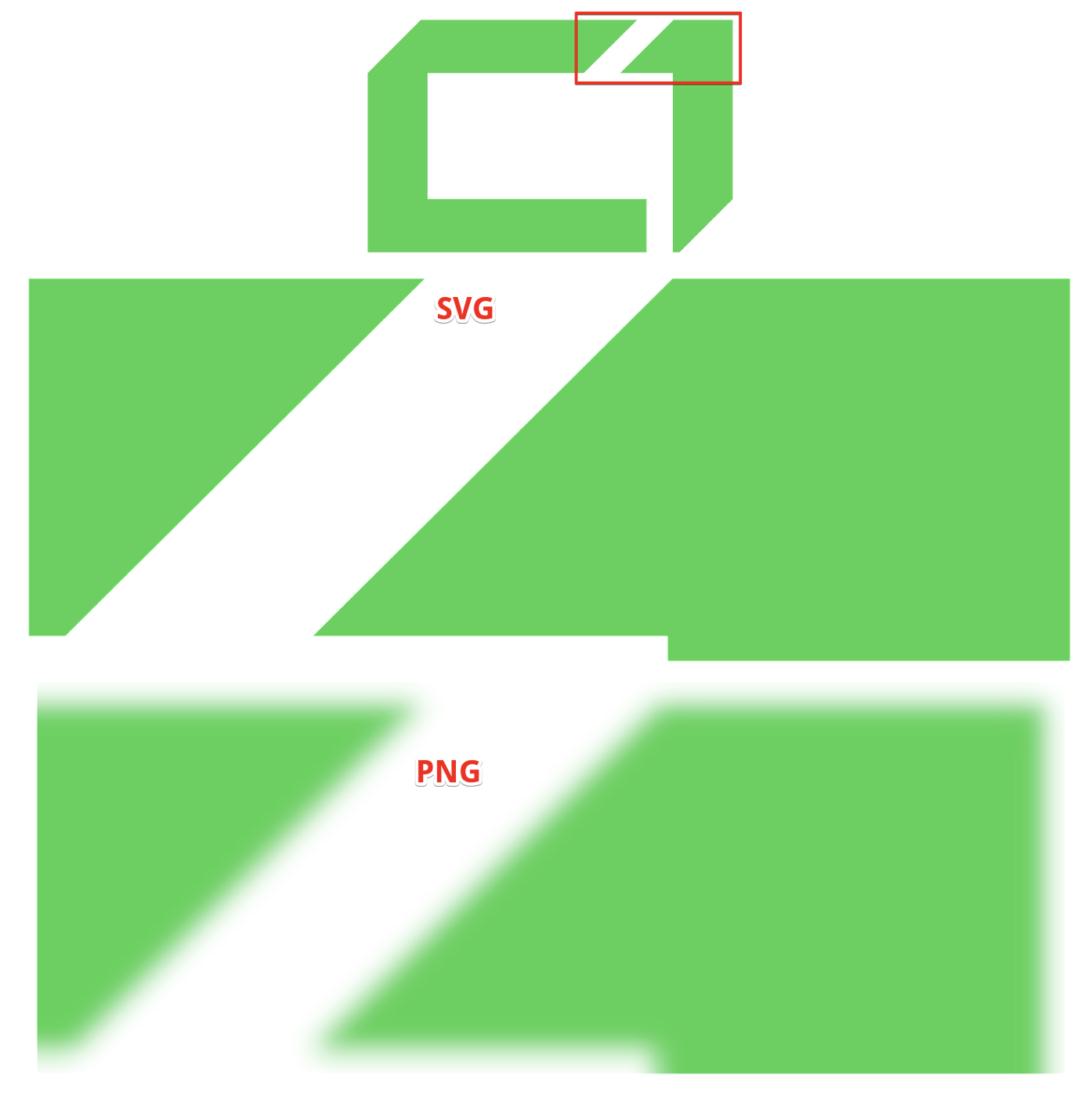 SVG格式比较特殊,与其他格式有很大不同。 SVG图像存储的是几何形状,而不是每个像素的值。 它的主要优势是可以无限放大而不会造成质量损失,具体可以看下图的对比: