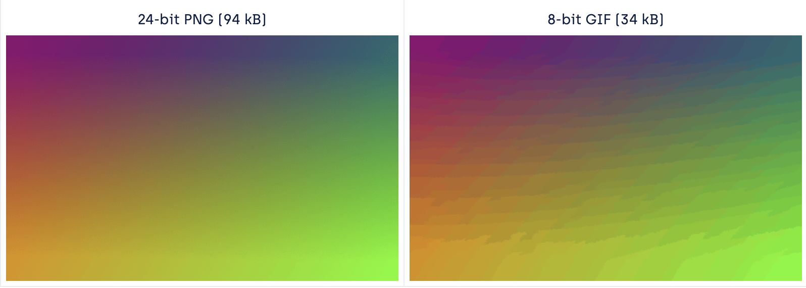 GIF具有无损压缩和有损压缩的混合特性。像素表示形式是无损的,但是颜色深度限制为每个像素8位(即每个图像转换为256色,原始的图像如果是RGB格式的,每个像素实际上使用24位来表示的)。这意味着文件将包含较少的颜色(每个文件最多包含256种不同的颜色),但文件体积更小。 这是24位PNG和8位GIF之间的色彩表示的比较。