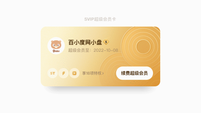主题色延续了网盘会员色系,超级会员为金色,会员为红色,在此基础上调整色彩明度。新配色在产品界面和运营活动上,能给用户带来更加直观的身份感知。