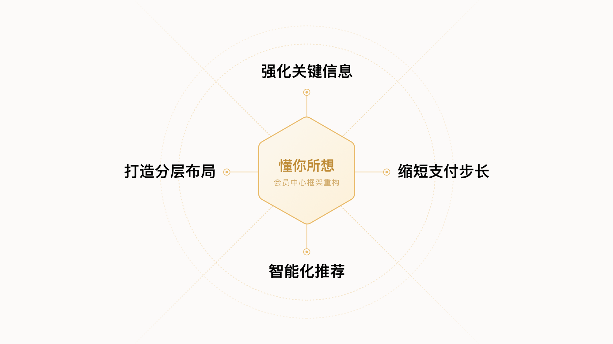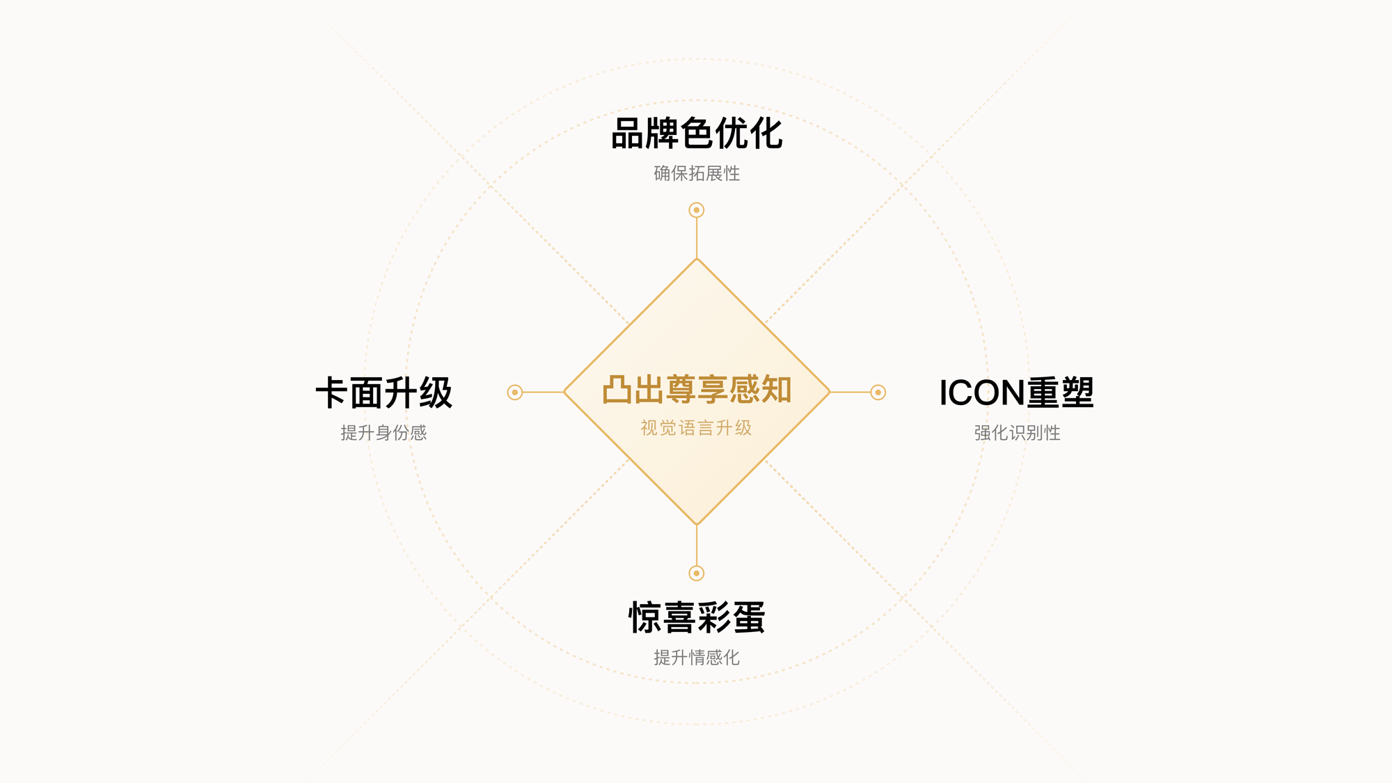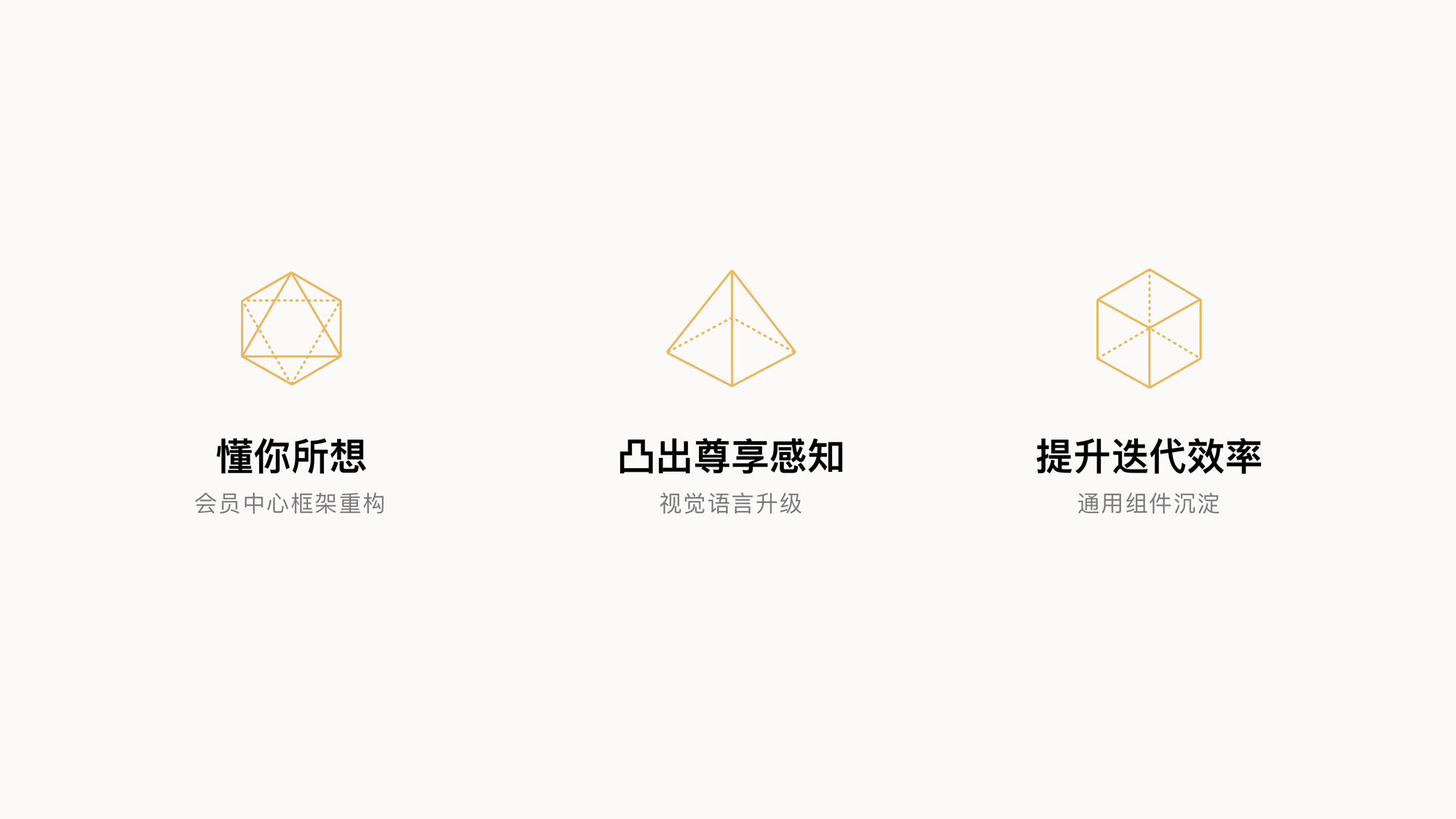 明确了目标后,我们从以下维度进行设计升级,解决现存问题:1.懂你所想,会员中心框架重构;2.凸显尊享感知,视觉语言升级;3.提升迭代效率,通用组件沉淀。