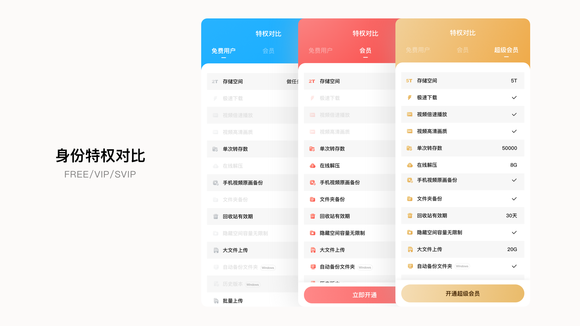 此外,我们还强化了特权对比的差异,分别展示了普通用户、会员用户、超级会员用户拥有特权功能的差异性,便于用户根据自身需求选择对应更为合适的会员服务,避免买错等一系列不便或者多花冤枉钱的行为。