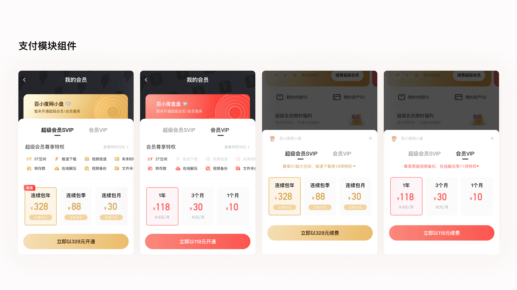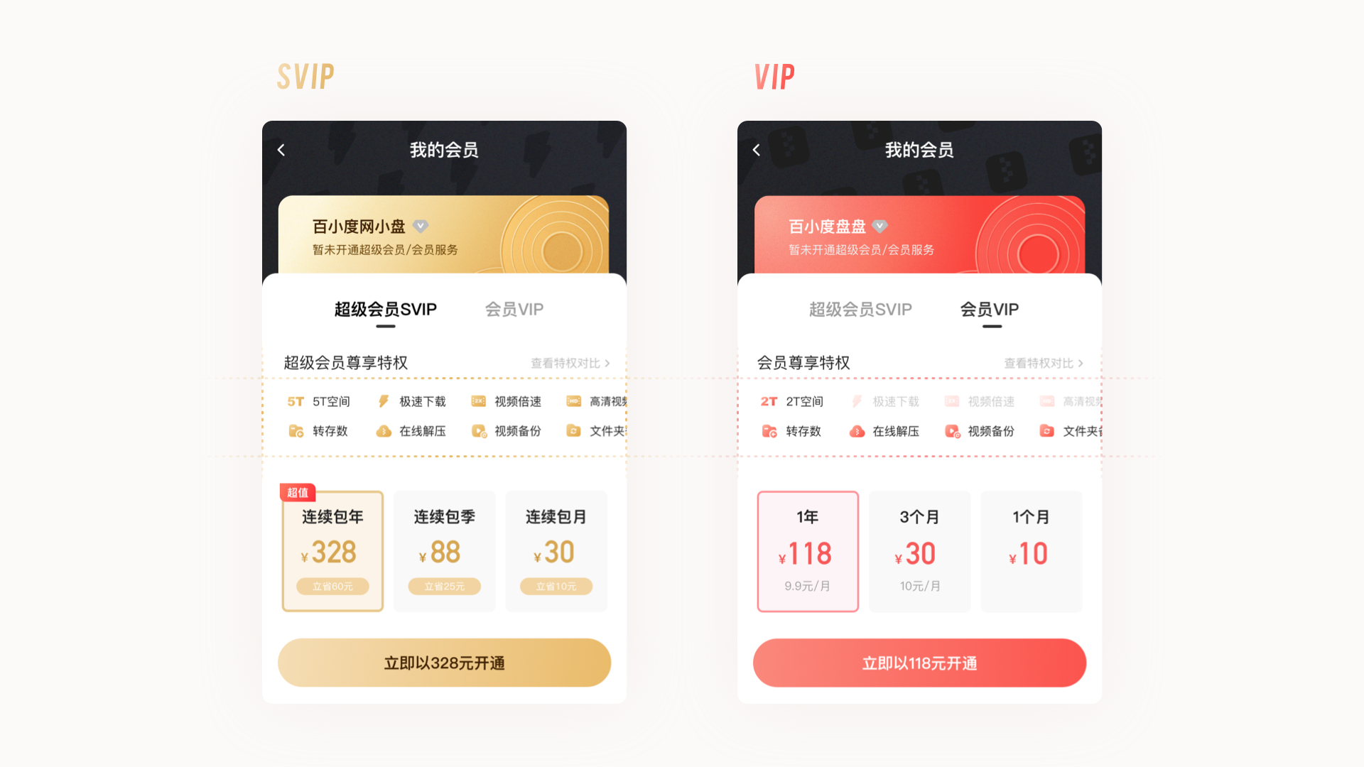 为了便于用户感知到会员与超级会员之间的差异,避免错误购买带来的困扰,我们通过品牌色(超级会员的金色,会员的红色)进行区分。