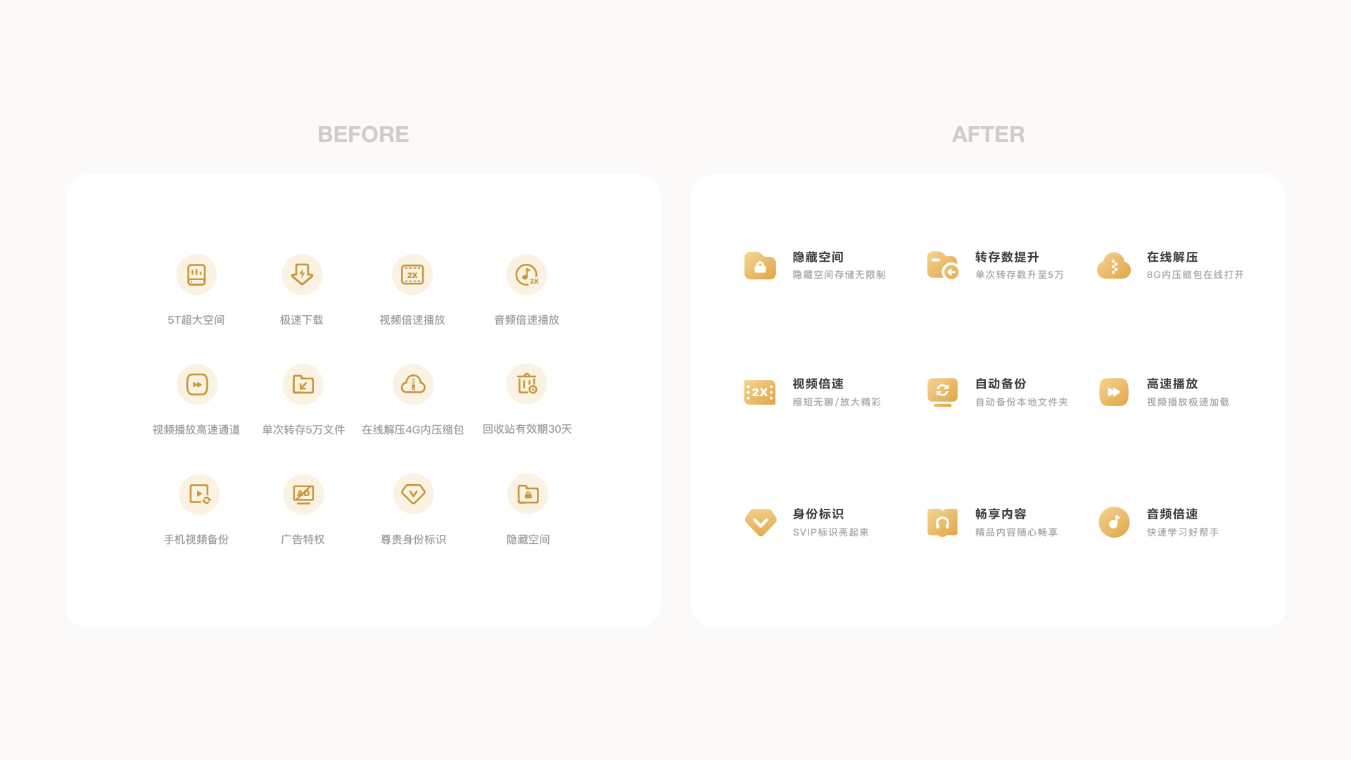 关键信息也是用户更为“关心”的信息,通过调研发现,网盘用户更加关注会员优惠活动信息、服务到期提醒以及会员之间的差异性,因此在本次升级中,我们对用户所关心的决策信息进行强化,恰如其分地展示便于用户决策,同时提升用户的付费意愿。