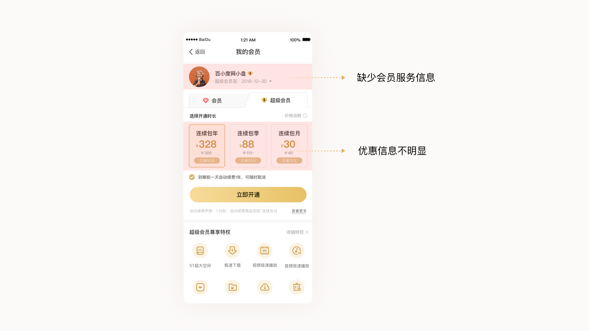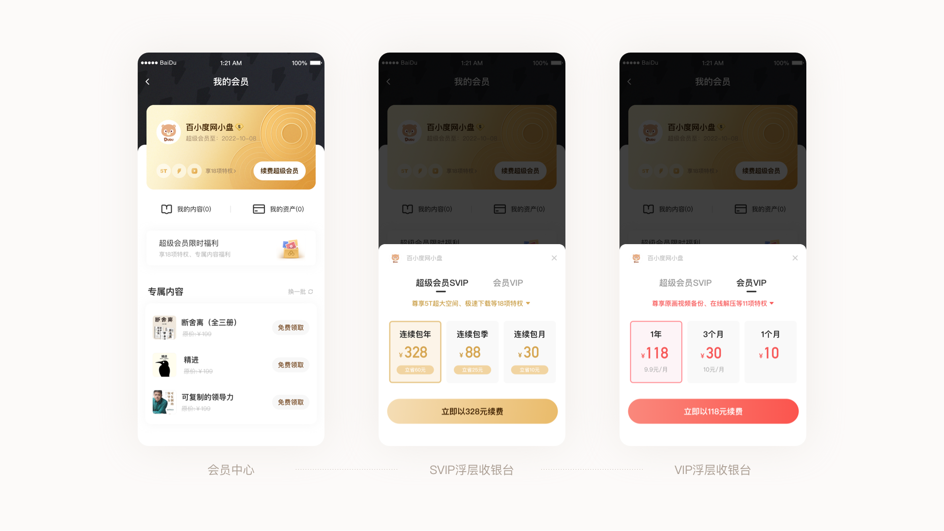 以下是百度网盘UE团队近期对会员中心体验进行优化,希望对大家做商业化产品有所帮助。