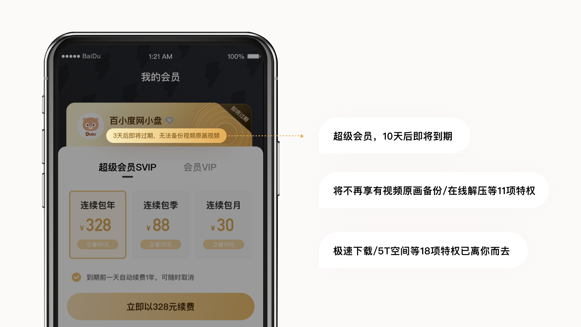 针对即将过期或已过期的用户,我们会展示用户常用特权功能的即将到期的信息,避免用户特权功能到期后,给用户日常使用带来困扰,比如使用视频原画备份等功能,我们也会提前告知给用户:“3天后即将到期,将不再享有视频原画备份和在线解压等11项特权”,让用户提前做决策。