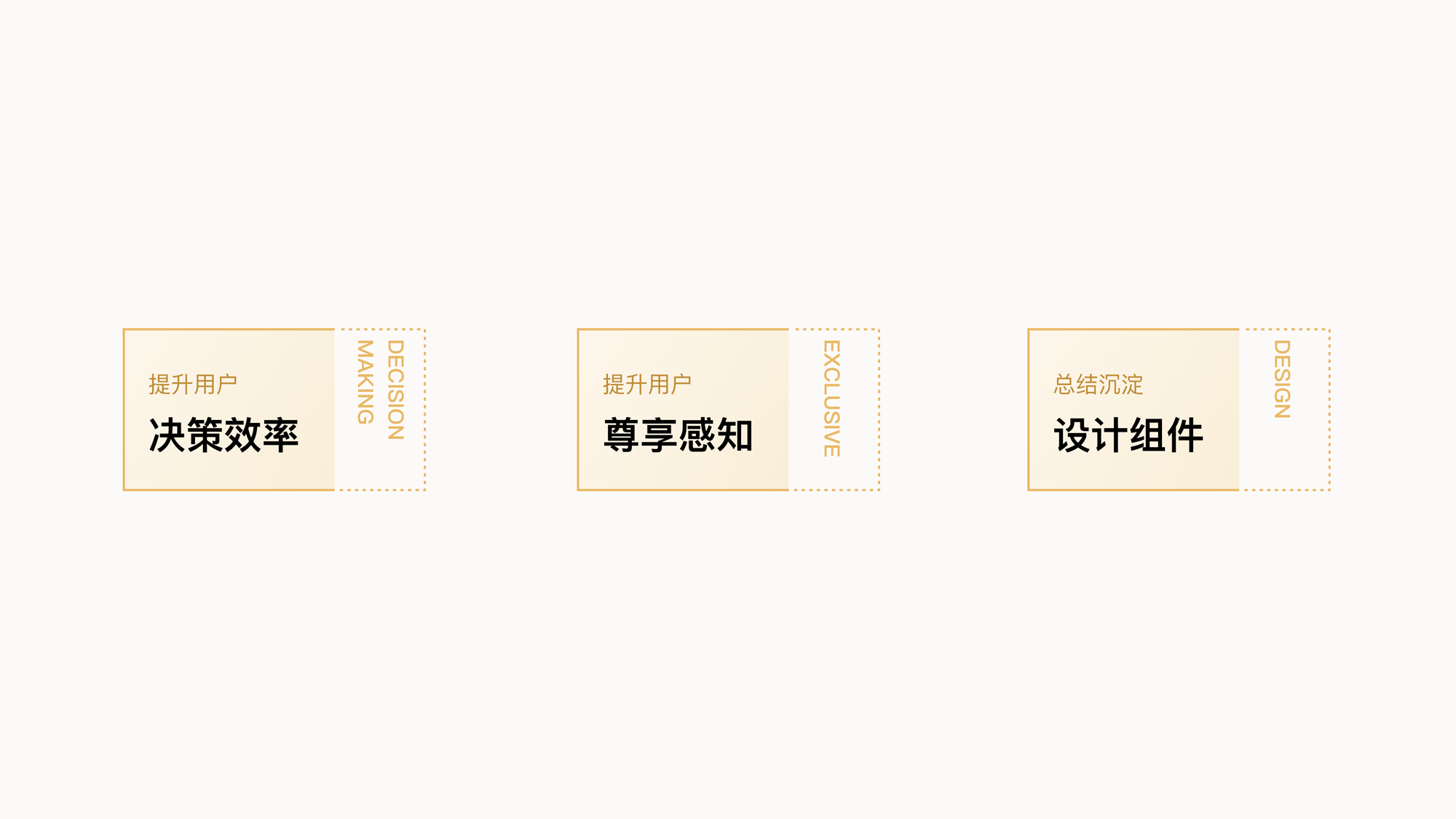 在着手推进项目设计前,我们通过定性和定量的分析,并组织多角色对本次升级的目标进行确认,本次升级的目标是:1.提升用户决策效率;2.提升用户尊享感;3.沉淀设计组件库。