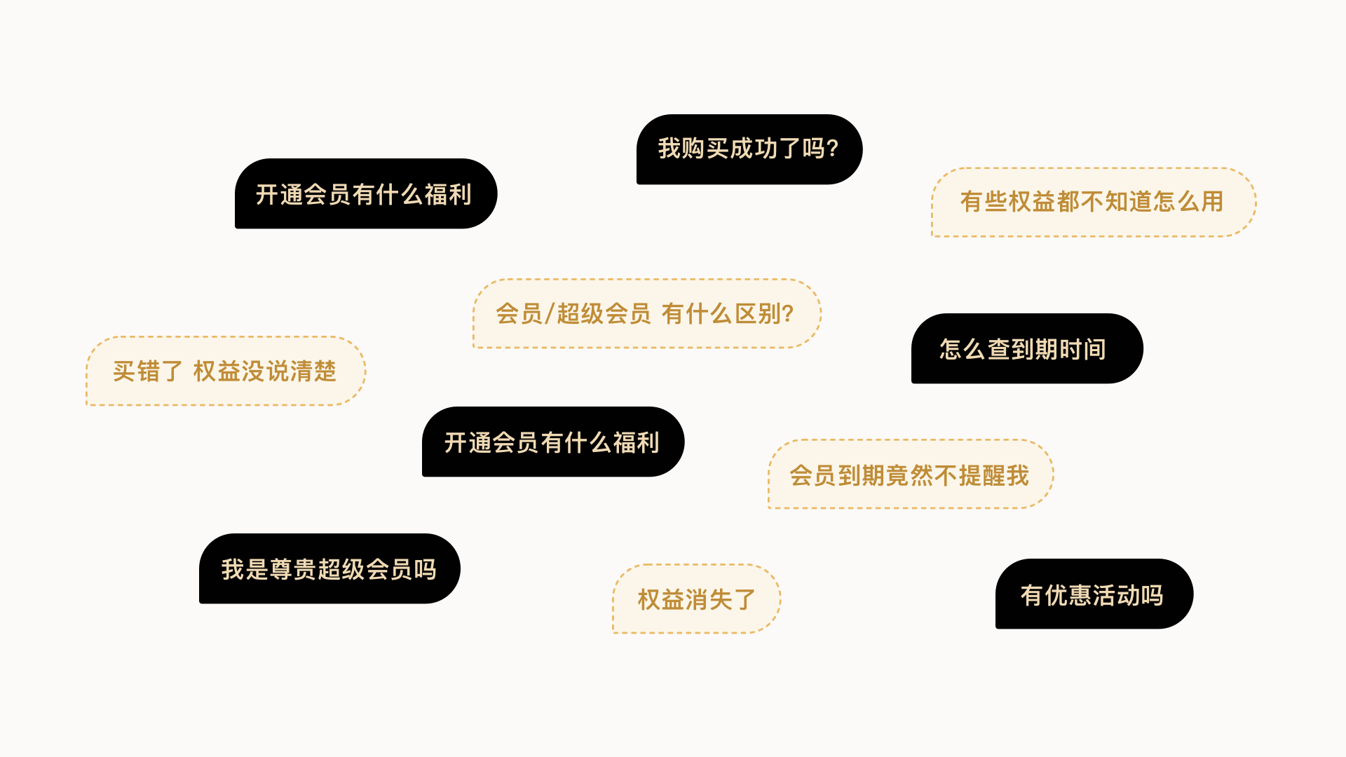 购买会员后用户,产生疑惑“是否购买成功了吗?”;身为超级会员用户,“感受不到任何尊享感受”;快过期的会员用户,“对会员/超级会员快过期的也感知不到,导致特权中断,影响使用体验”…