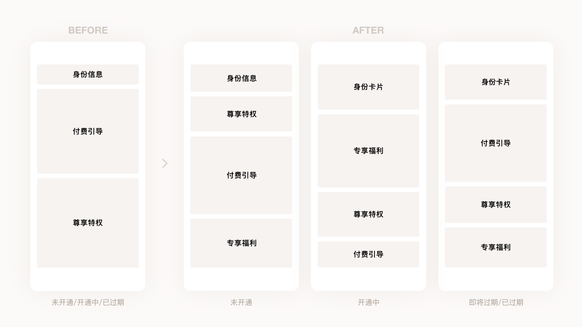 当用户是历史未付费用户时,我们更加突出用户的特权介绍和商品支付,便于用户了解会员服务和商品信息;当用户是开通中的用户,我们更加突出用户可尊享的福利信息,突出尊享感;当用户为即将过期用户或已过期用户时,我们展示用户常用特权信息,唤醒用户付费意愿,并为用户提供便捷的续费能力。