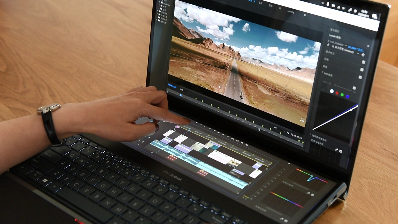 在Pr等制图软件中,特别适合使用双屏,工具和预览界面分配很方便,可以将时间轴拖拽到第二屏,方便触控操作的同时,展示窗口也更为宽广。