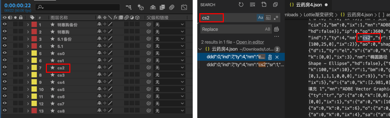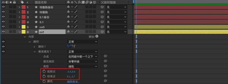 1、在sketch/ps 里制作好带有渐变效果的的设计图,在AE中完成动画的制作后,这里注意最好对图层进行下命名方便后面修改参数的时候进行查找。我这里命名是:cs1/cs2/cs3…