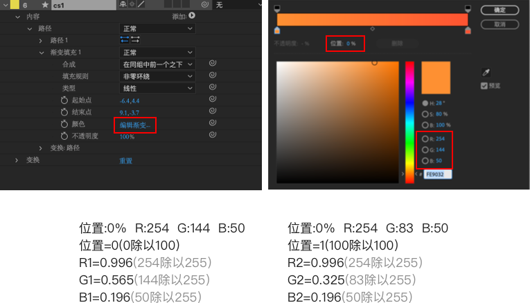 5、到这里,我们看“cs2”后面的出现的 [0,1,1,1,1,0,0,0] 数组。这就是我们的渐变为啥变成黑白的原因了。这里需要换算一下,因为这里的参数需要的的是RGB颜色值的百分数。不能直接使用RBG颜色值的整数。