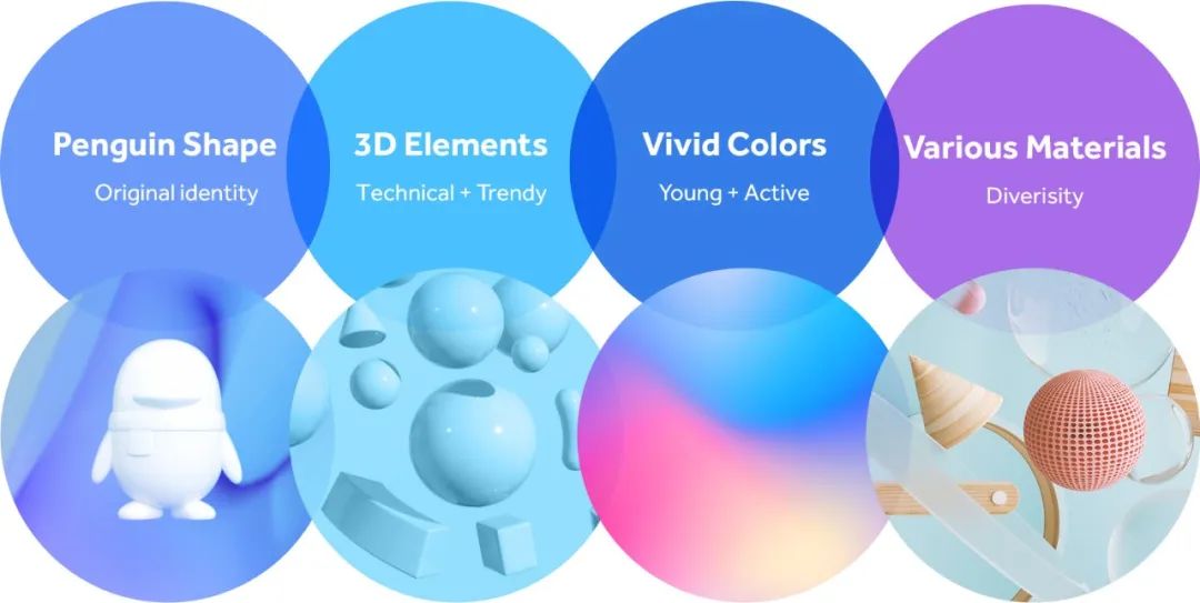 The first idea was based on the aforementioned plan, experimenting various new and attractive graphics without any specific limitation. The shape of the QQ penguin was dismantled and various materials were tested and we also tried to add various graphic elements around the penguin shape. And we tried to use a wide range of hues and high saturation colors besides the sky blue color, which is the brand color of QQ.