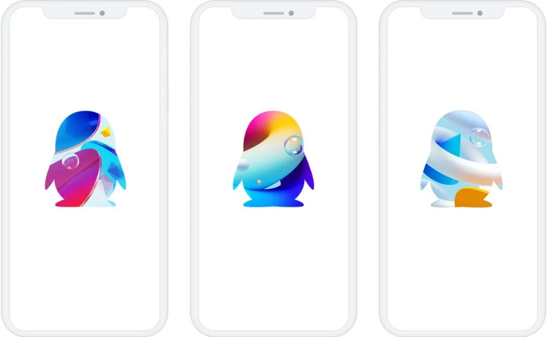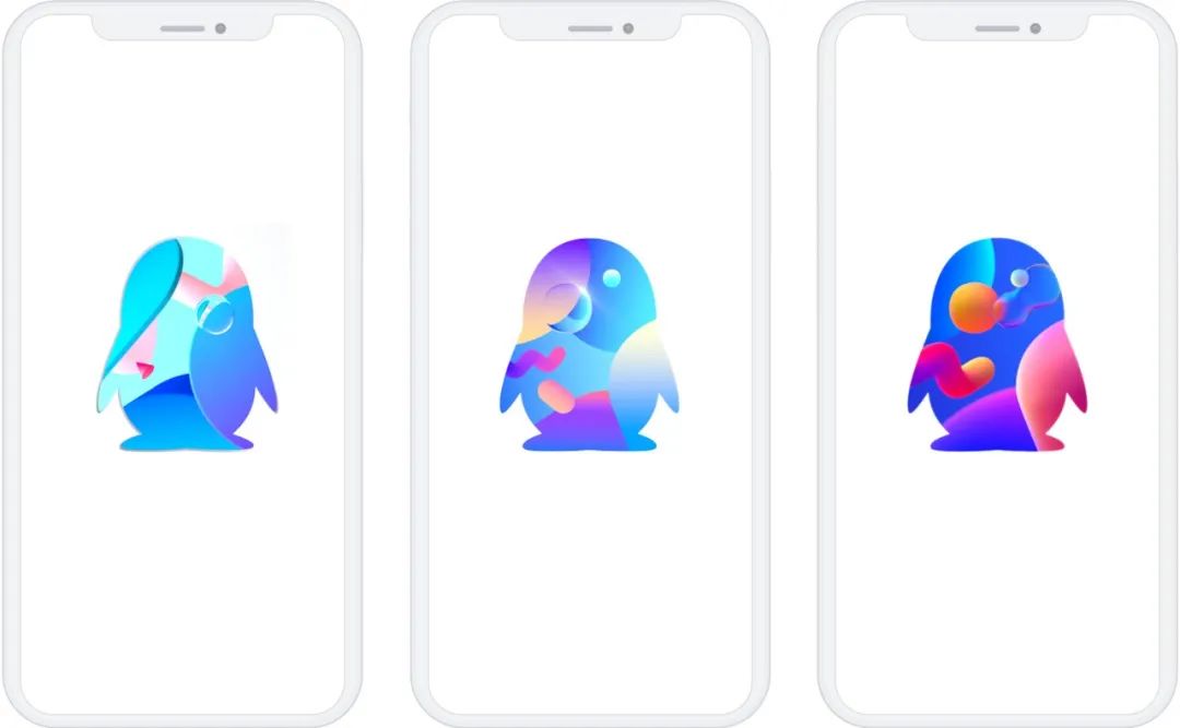 第一个方案是基于上述计划,没有任何限制地尝试各种新的和富有吸引力的图形。我们拆除QQ企鹅的形状,测试各种各样的材料,并且尝试在企鹅形状周围添加各种图形元素。除了QQ的品牌色天蓝色,我们还尝试使用多种色调和高饱和度的颜色。
