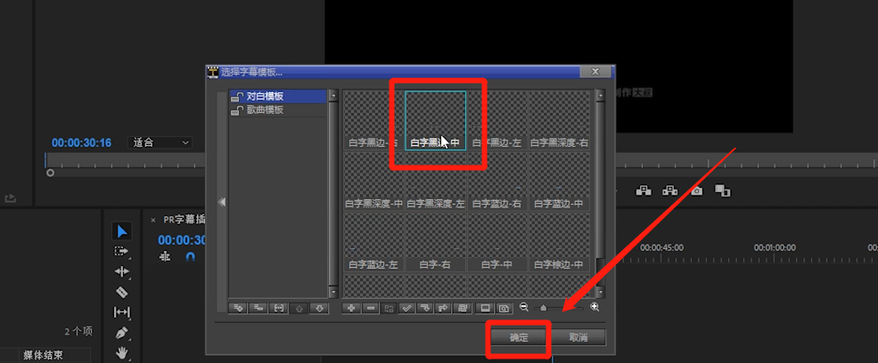 (如下图)点选自动匹配—从模板库选择—白字黑边居中