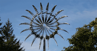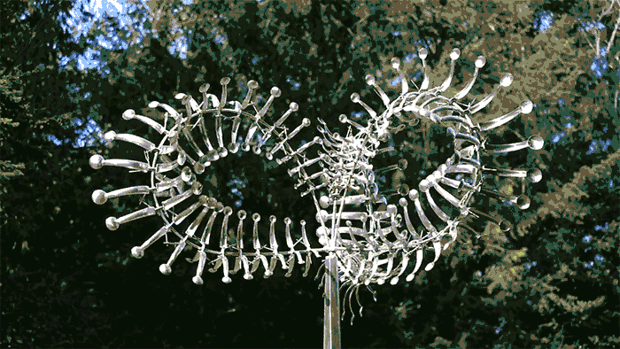 哪怕是一点点的风力,几十个部件组成的装置都可以运转起来。组件间的排列组合都经过了精致的设计,非常具有韵律变化,有的像蒲公英,有的像向日葵,有的动起来如水母的触须,虽然看起来相当魔性,却也有种另类的美感~