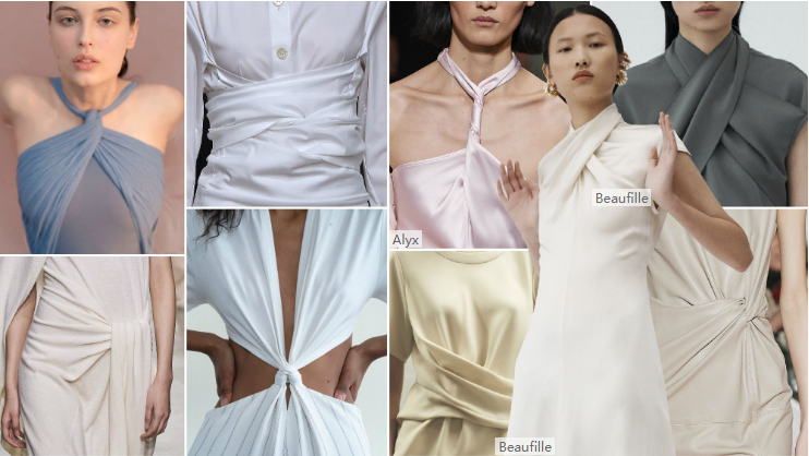 扭曲垂感面料让简约家居服上衣、针织衫、吊带裙更能显露身材,并赋予它们动感。用扭曲垂感面料升级简约单品,将优雅扭曲细节环绕颈部、胸口、腰部,为极简绸缎吊带裙增添时尚感。使用中性色和浅粉蜡色为设计营造宁静健康的格调。