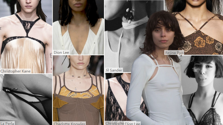 使用多条带打造装饰领口,方形领口和无肩带上衣的发展势头使文胸和肩带变得更加醒目,被当做造型元素。尝试全新挂脖设计或多条带设计,为吊带裙和小背心增添时尚感。精美领口也为简约贴肤紧身衣和形体服带来了启发。