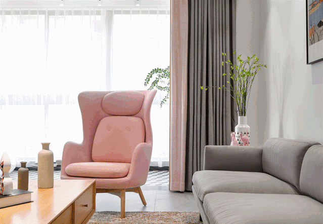 ▲大象灰丝绒、黄铜元素…自然的材质,融入现代感的色块和线条中,让珊瑚粉休闲椅成为点睛之笔。定制加长的沙发,颜值高、易清理,能满足一家人其乐融融的团聚。