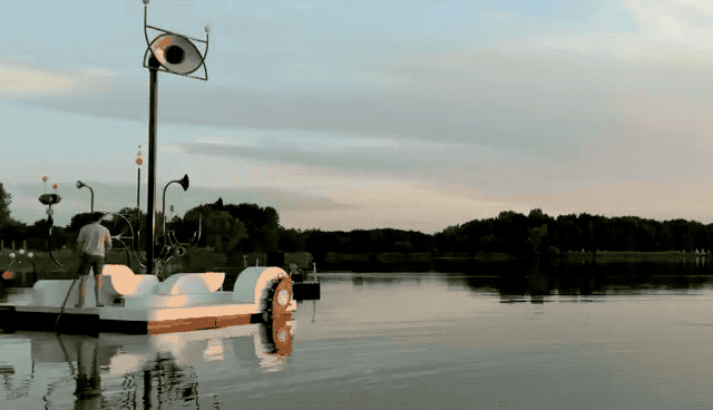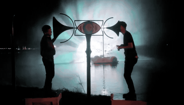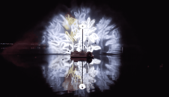人们越是向湖岸边潜望镜似的装置里大喊,湖面上的迷幻动画就越是明艳多彩;人们跳舞和喊叫的次数越多,他们越能直接影响节日上的动画和视频。仔细看,你会发现惊喜不仅是毫无意义的图案、形状孤立的展示,更重要的是,它还可以通过水幕的形式,给你娓娓道来一个生动的故事,让人更加无法错过,戏剧性也凸显得十分明显。除了动作还有声音,对着装置上的“喇叭”呐喊,水幕也会随着声音而改变,给予了观众全方位的感官体验,“体验与分享”是这个show的精神所在。