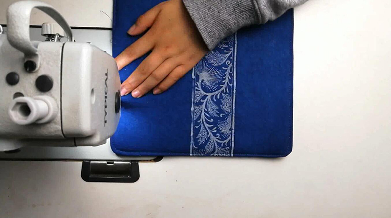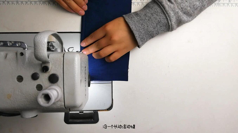剪两片里料(尺寸长为面料长,宽为1/2正面宽),沿一个长边滚边缝,另外3面分别留1cm缝份粘贴在里料上。