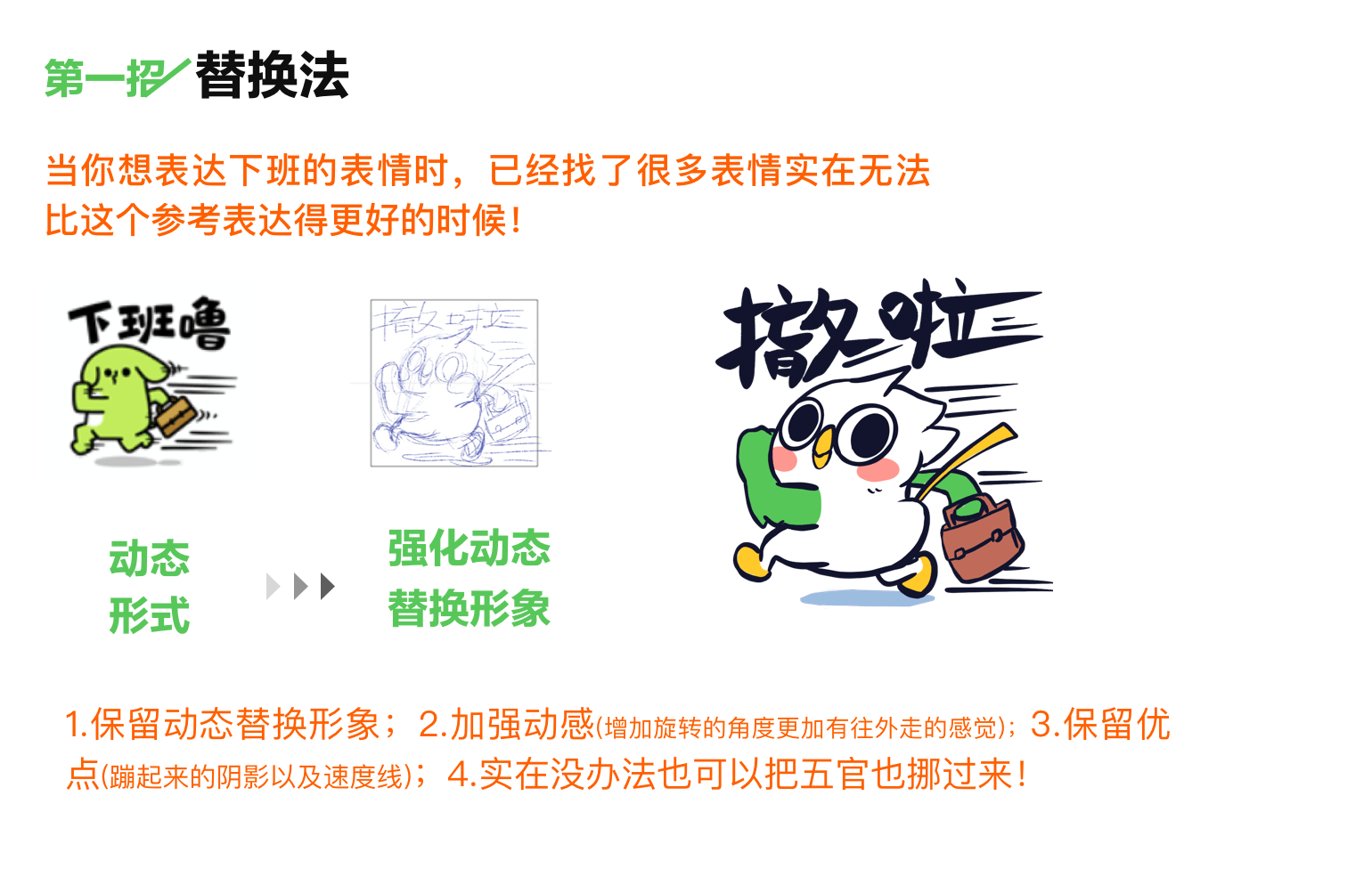 通过往次的数据验证分析,再结合产品线对于表情的需求(对本次的场景和内容的选定起到关键性的作用,其次就是关注到运营或者产品活动的需求);相比第一次的表情包,本次优化方向基本放在更加的生动和把场景更加聚焦在日常工作中。