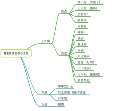 1.先是分语境。在工作场景中需要表达的地方很多,需要细化到场景中确定下来。我把工作分为:工作中、休息时、下班。因为大部分是在工作中的使用场景,故“工作中”再分为“交流”与“表达情绪”两种。