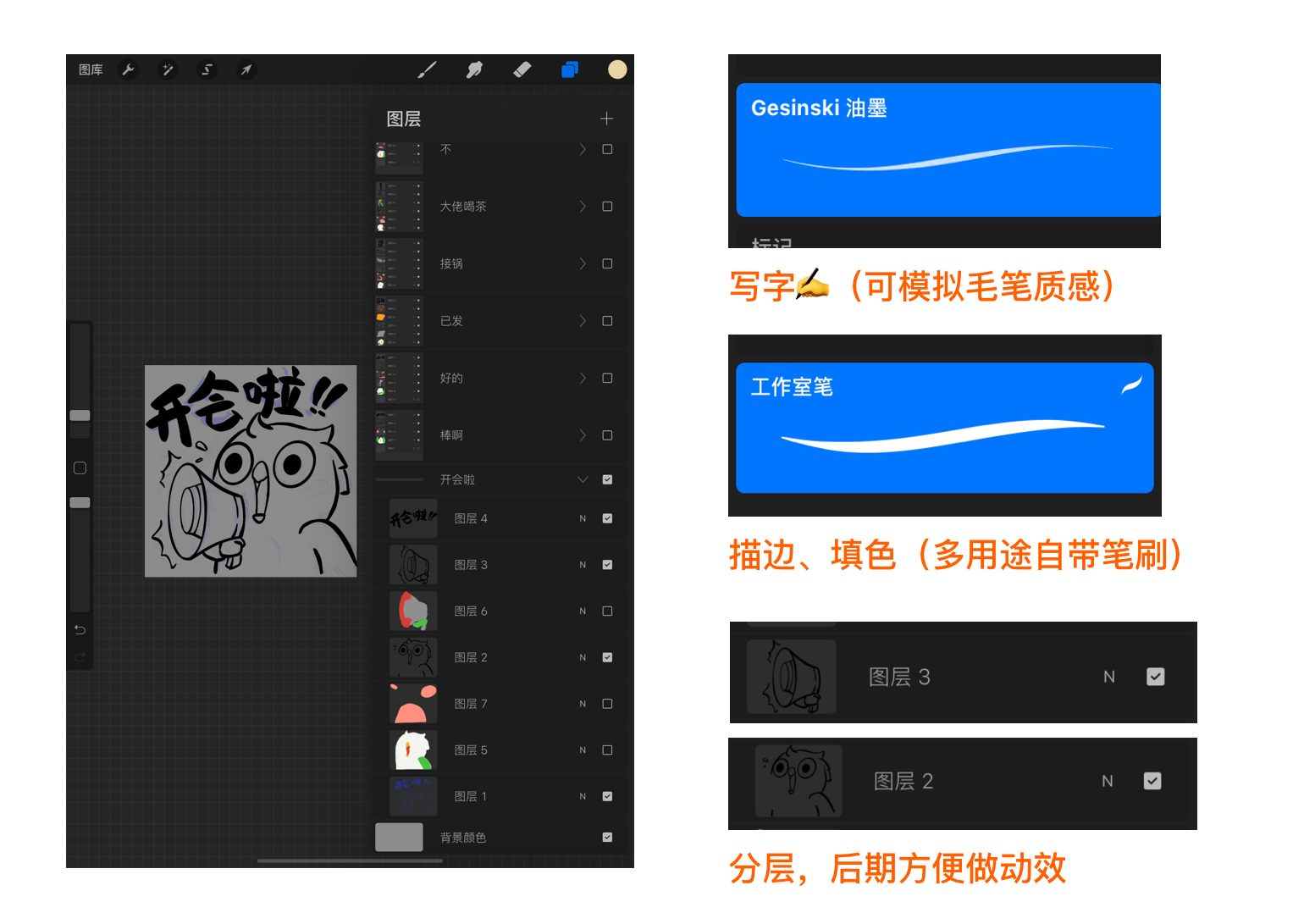 我这次是使用了ipad作为绘制表情包的主要工具,但主要还是根据需求选择。ipad适合绘制纯手绘的风格,如果需要非常规则的扁平风或者矢量风格还是建议用回ps和ai噢。ipad无法建非常大的画布,适合尺寸精度要求没特别高的设计。