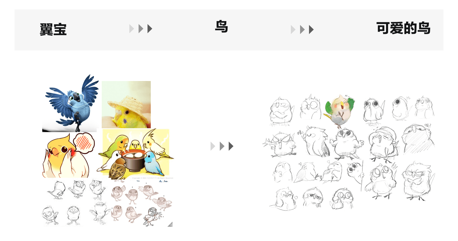 通过找到同类型的形象快速找到共同点(迪士尼草稿概括性强有参考价值),再通过草图完善翼宝的各个形态特征,以求达到舒服统一的状态(以便后续作为参考和设计师自己的快速输出打好基础)。