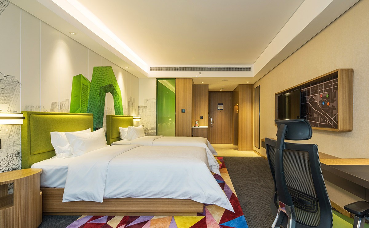 希尔顿欢朋酒店设计风格清新明快,热情活泼。设计色彩以浅暖色为主色调,用丰富且直观的"多彩"色进行局部调节,