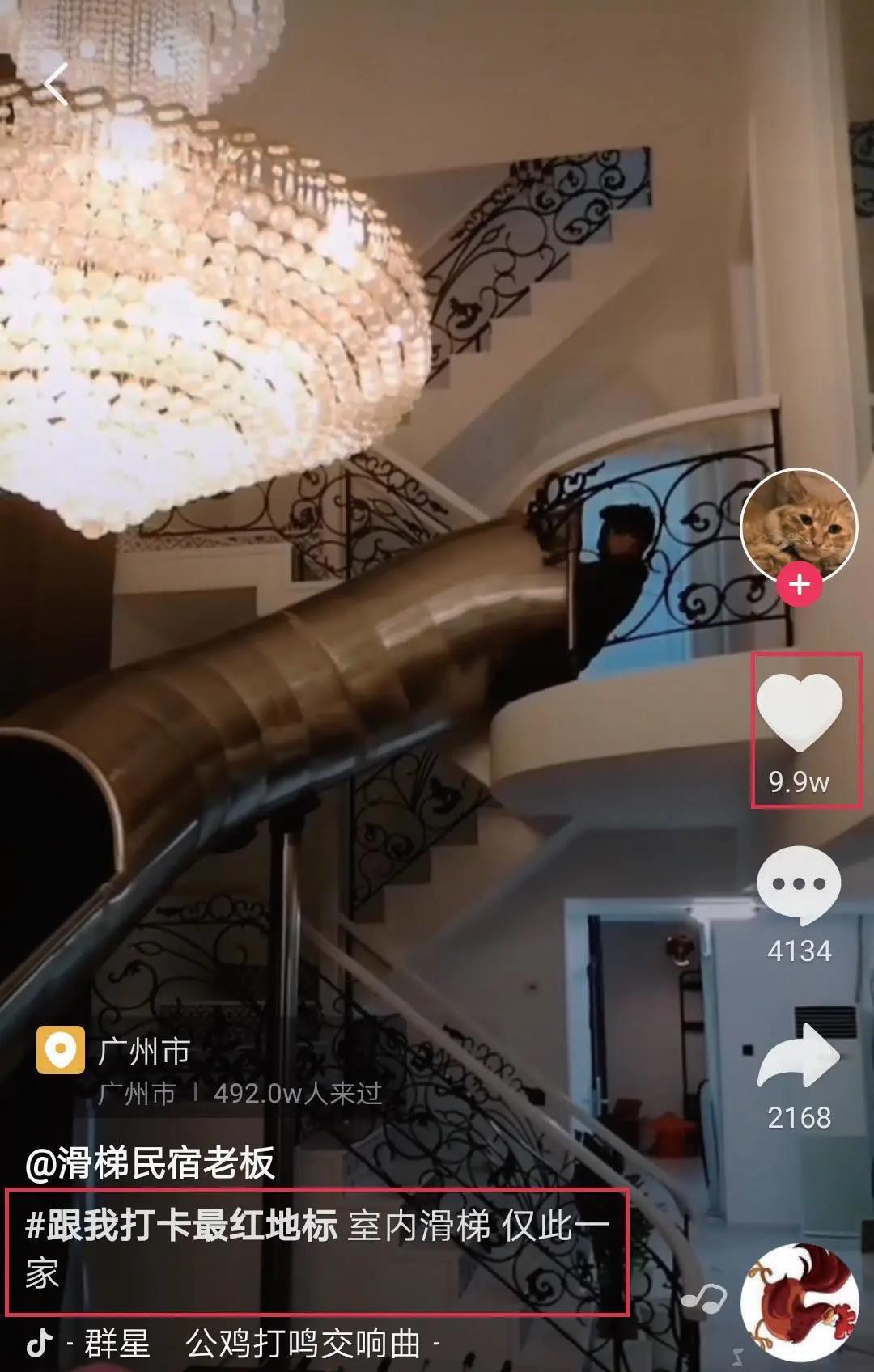 下图所示的视频标题是“跟我打卡最红地标室内滑梯仅此一家”, 看到这个标题,用户更想去点击视频,如果正好在当地旅游,也会更加想去订购这个民宿酒店,这个视频获得了9.9万点赞量。