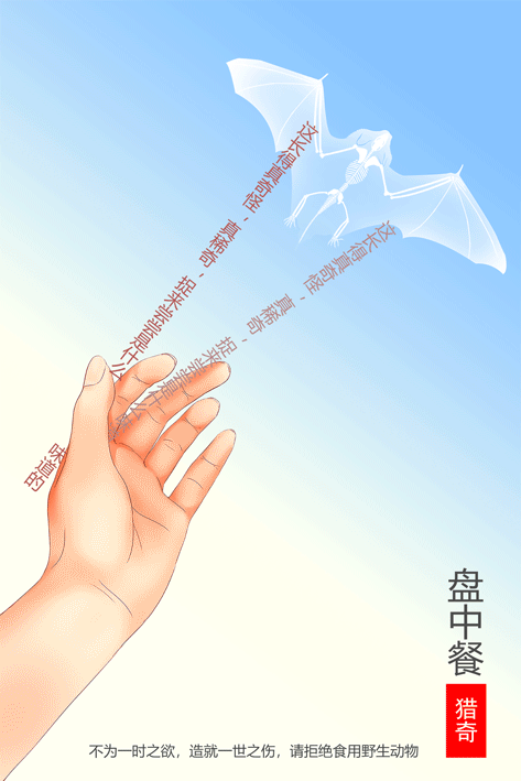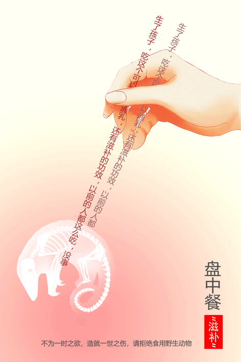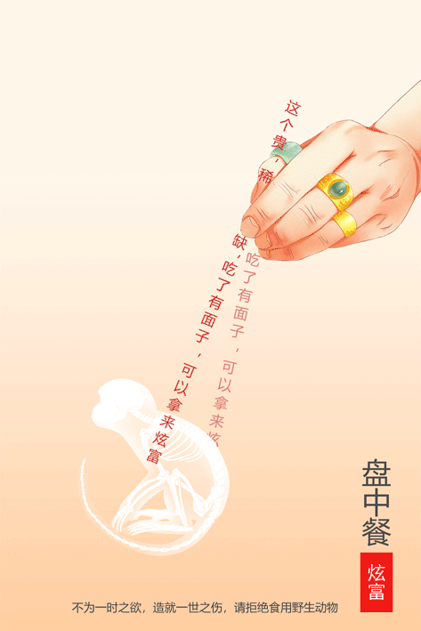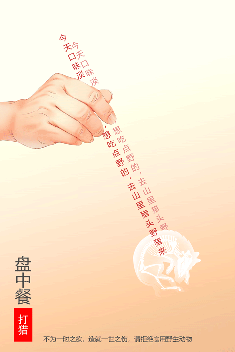 简介: 在食物充足且营养健康的当下,我们当中一小部分人仍然选择冒险去食用野味,从而导致了一系列的社会性传染病的爆发,在这种背景下,引发出我对食用野味的人为什么要去食用的思考,经过我的一个研究,我发现导致这种情况的主要原因有为了滋补、喜欢猎奇、喜欢炫富和喜欢打猎。于是,我就选择了《盘中餐》和《饭局》这两个系列,以海报的形式进行展示。