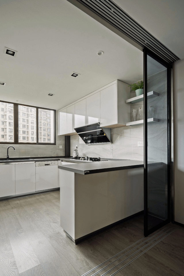 除了为视觉考虑以外,同时为了增加厨房操作和收纳空间,本案扩大了厨房面积,餐厨区域以玻璃移门区隔,增加橱柜空间。