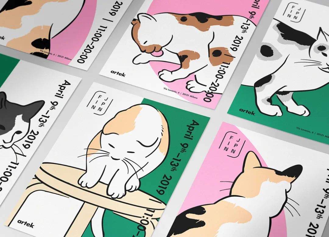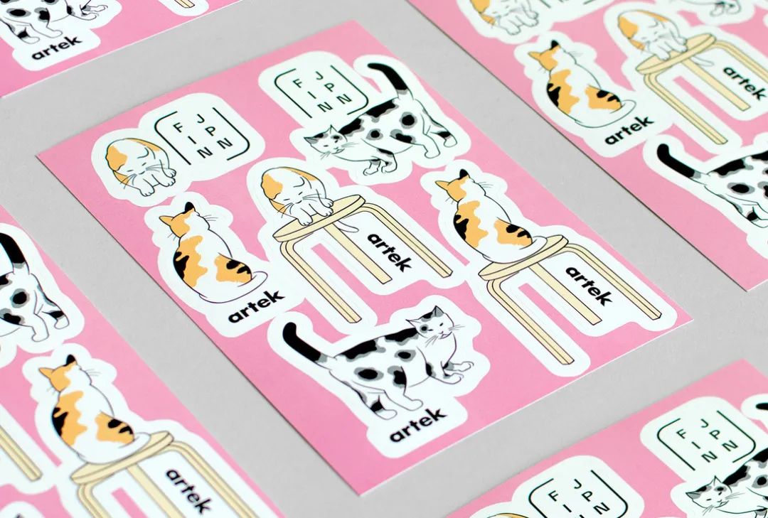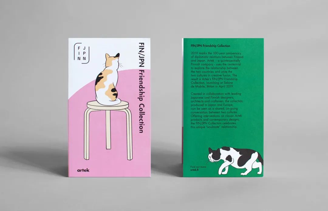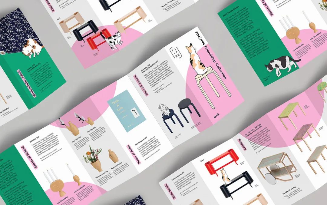 以上是赫尔辛基Artek举办FIN / JPN友谊展的形象设计。软萌的三花猫成了这次展览的代言人,它象征着温柔的陪伴。我想这至少有两层含义:1、Artek旗下的家具产品都以简约为主,色彩清淡,体现舒适人性化的居家理念。在芬兰,几乎每个家庭都拥有一件Artek的家具,这无疑是一种陪伴。2、芬兰和日本从1919年开始建交,历经百年,Artek也在与日本和芬兰的顶级设计师长期合作,两国的友谊,从政经到民间合作,这也是一种陪伴。