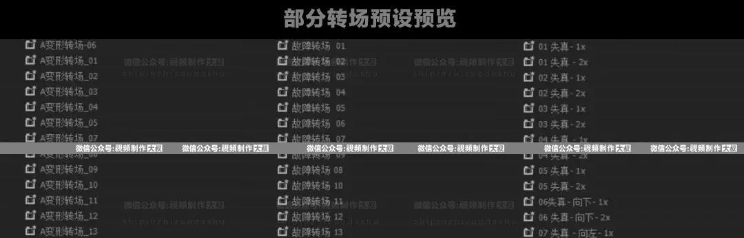 共6套预设,分别包含8+18+16+72+14+29共157个视频转场预设,包含信号故障、扭曲变形、平移等多种效果,都是prfpset格式,在预设栏导入即可,使用简单!