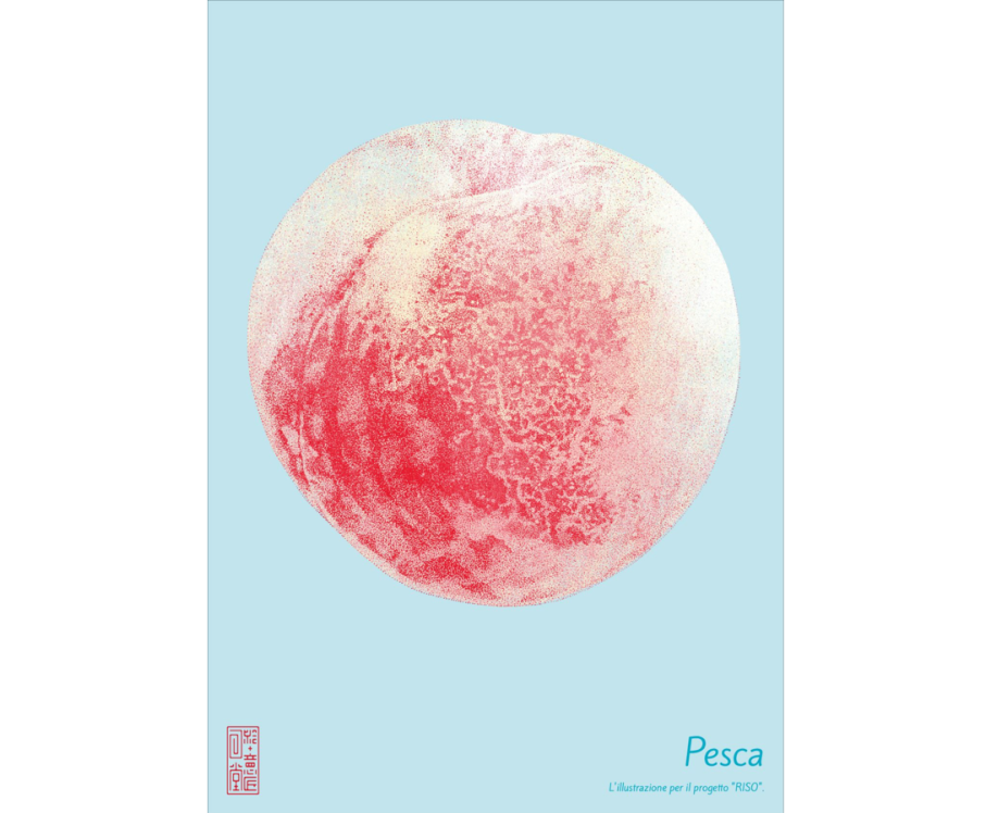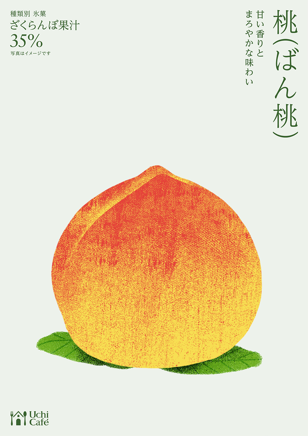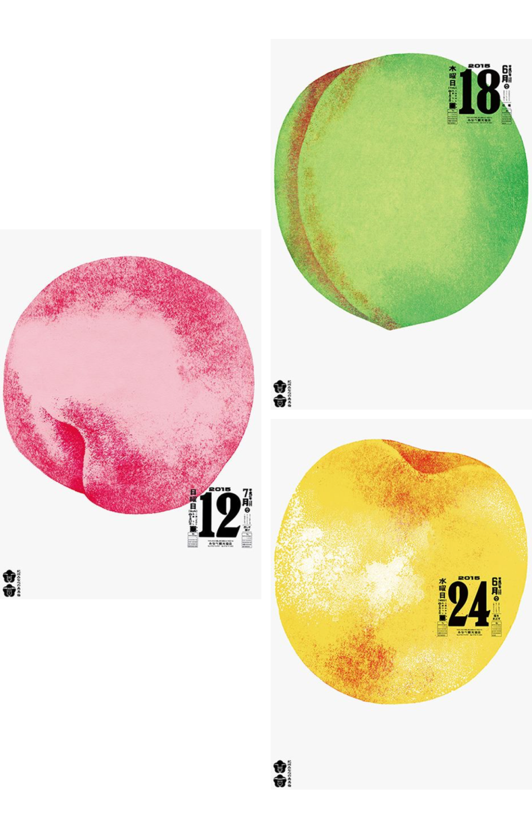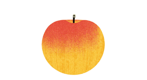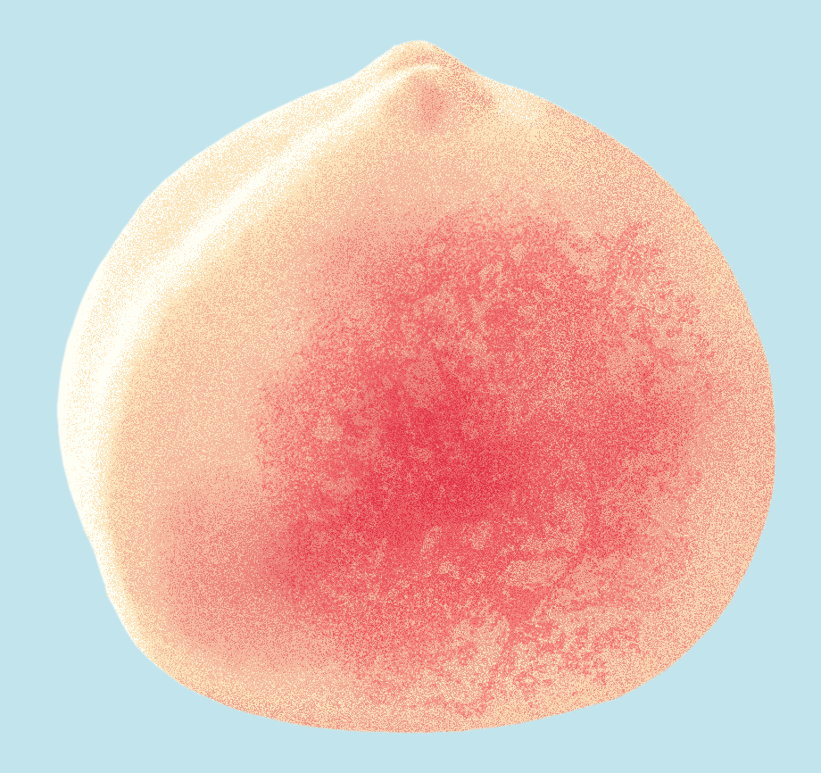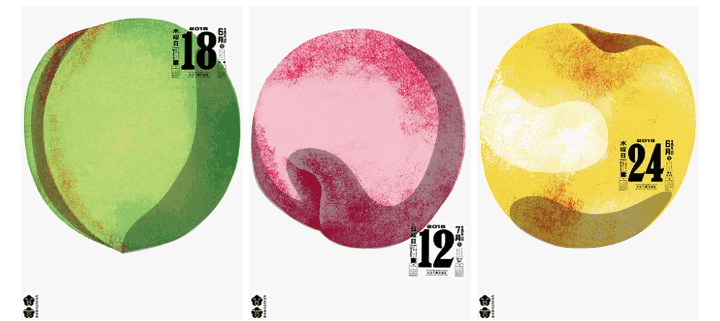 我们可以观察到,他的图形风格比较清新淡雅,没有较明显的明暗关系,而且整体都有种噪点化的质感,正是这种质感、纹理突显桃子的结构,也增强了画面的图形感。