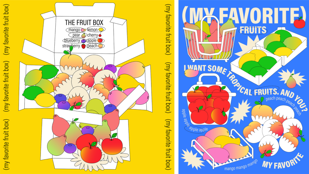 那就可以选择放很多个来丰富画面,只需要参考下现实生活中的水果包装(比如箱子、纸袋、或者平铺展示),让水果合理的连成片即可。