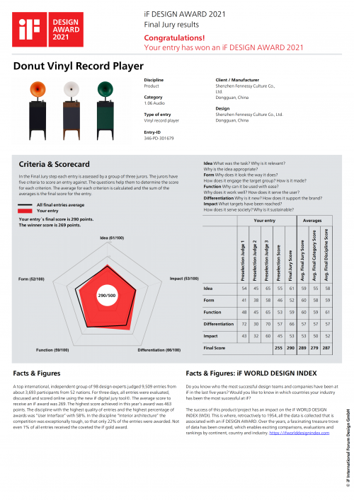 (Donut专业级留声机荣获2021年德国iF设计奖证书)