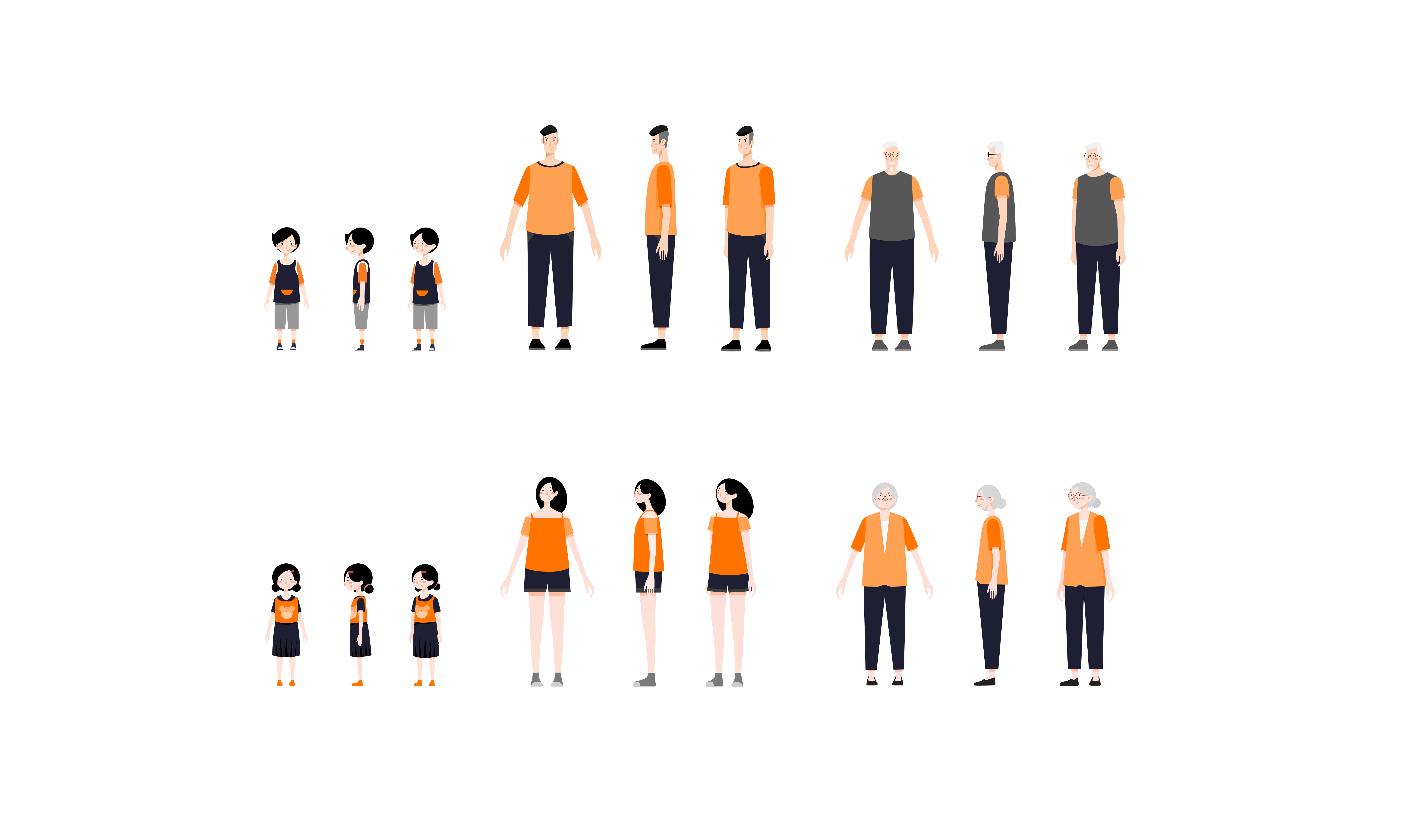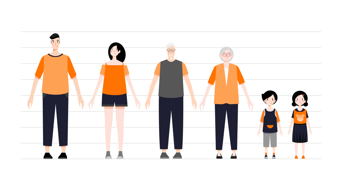 我们根据中青年人的头身比例设计,拓展出全部的六个人物形象。老年人头更大,脸身体发福,生长环境差及年龄大,普遍比中青年低。5-8岁的幼年儿童,处于生长阶段,设计为4头身左右。