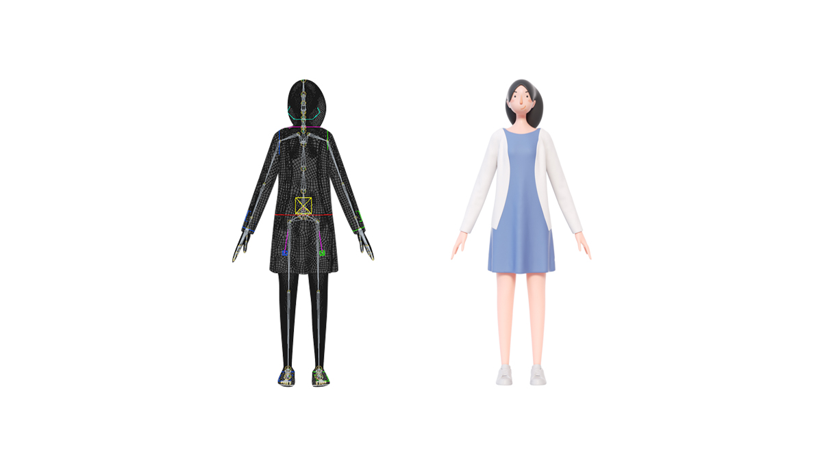 对人物进行骨骼绑定,使得人物可以遵循不同的故事及场景设定快速产出所需要的动作。不需要像2D时预先设计动作,这点比2D的使用更高效。