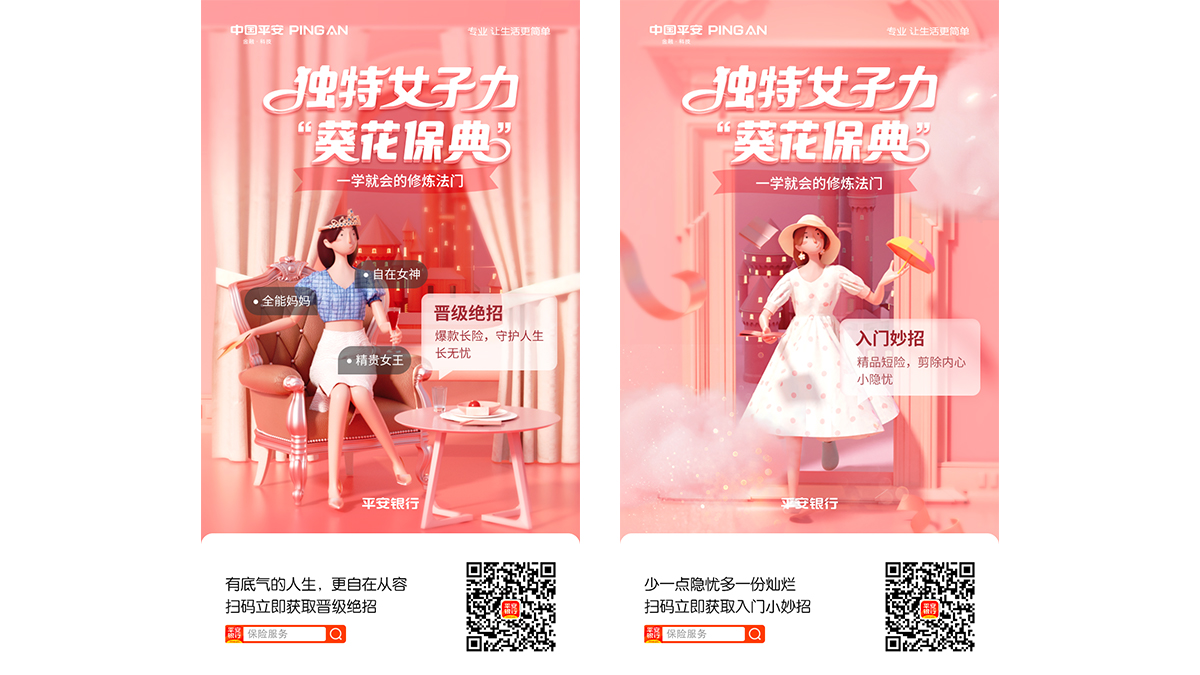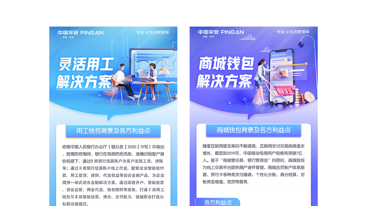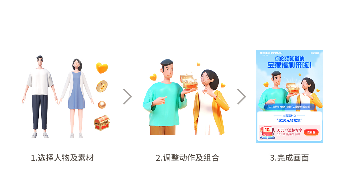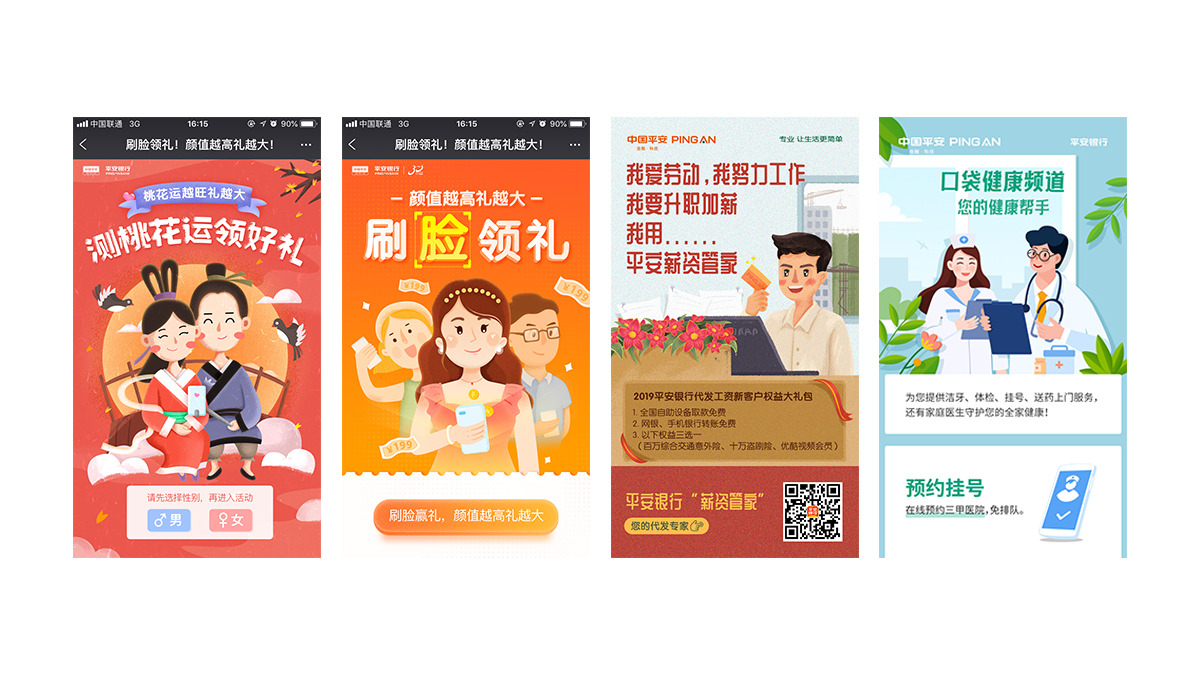 首先我们通过下面几个项目,检验平安银行人物形象体系升级后在项目中的应用情况,可以看到2D和3D人物广泛应用在了平安银行的金融+生活业务中之后,极大的统一了业务活动中的人物形象及设计产出水平。