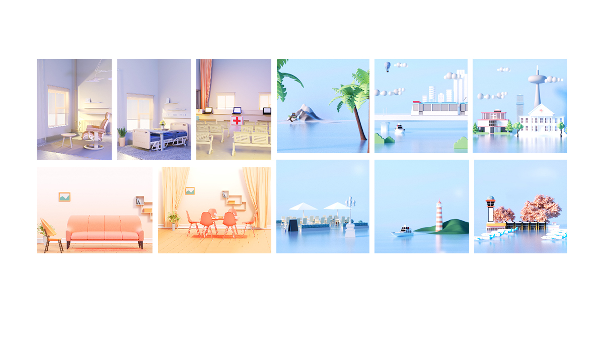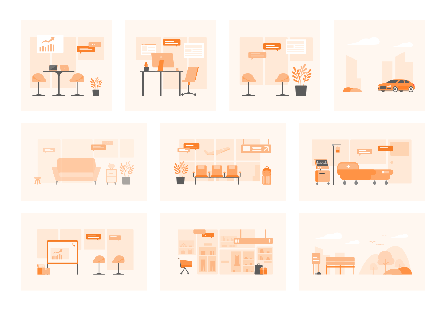 场景预设的主要诉求是简洁,保证画面的统一与效率。这里设计了使用较多的场景,包括办公场所、家、医院、机场、商场等。