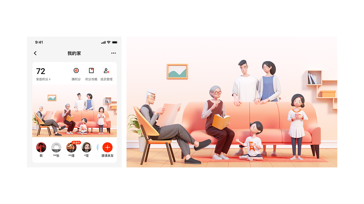 所以人物设定延续银行保险业务的一家六口设定:5-8岁的幼年儿女、35岁左右的中青年父母、65岁左右的老年爷爷奶奶,通过一家六口在不同场景的需求,来描述介绍平安银行的不同业务功能,以此引发用户共情。