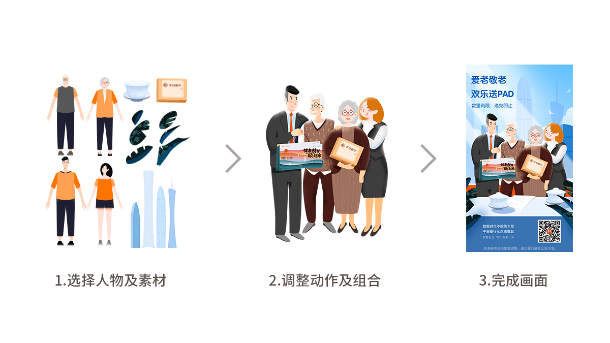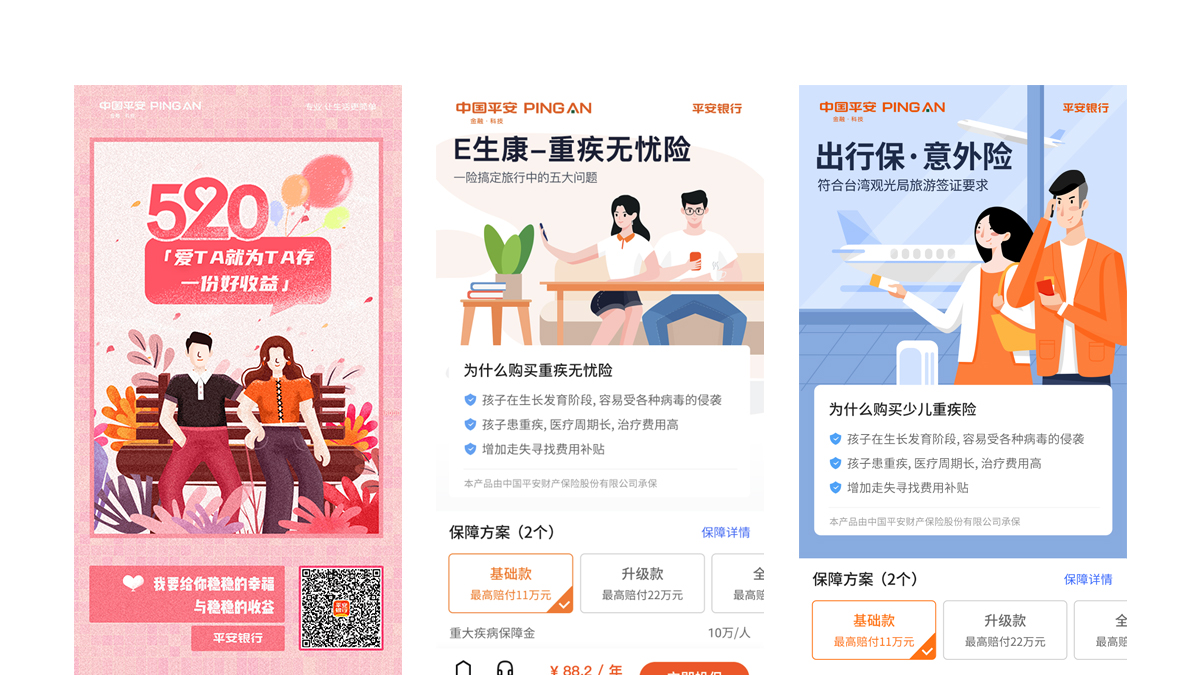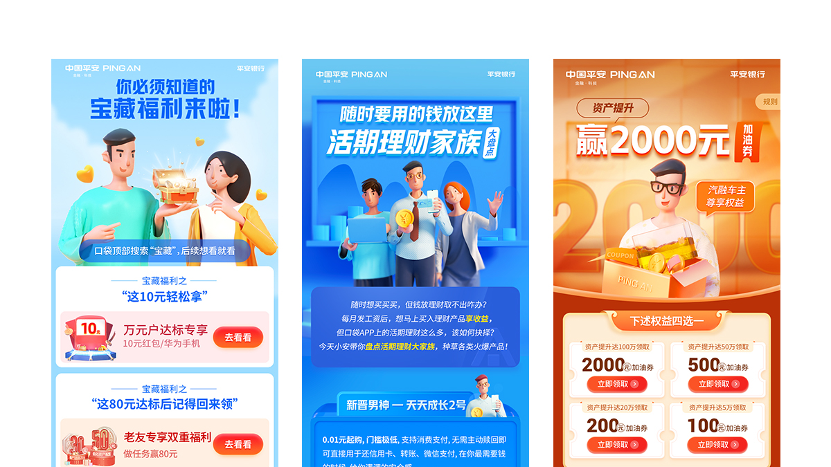 由于平安银行的运营活动多、设计周期短。为了响应快节奏的业务活动,我们经常会看到设计风格、质量迥异的人物形象出现在各业务的运营活动里。