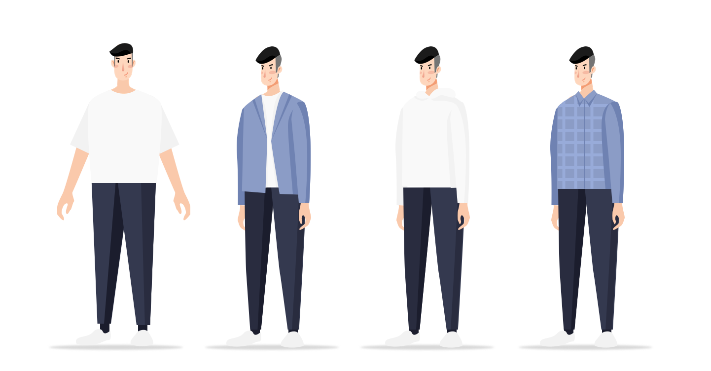 虽然现实生活中的人物比例是7头身左右。但在设计创意中,8头身比例更修长具有美感,故人物保持7-8头身的身高比例。女性与男性有一定的身高差,选择7.5头身。