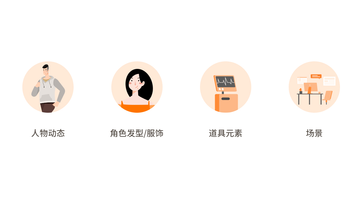 面对丰富的使用场景,我们绘制多视角人物动态,对常用人物动态进行预设,提高角色在业务场景的利用率,节省设计师更多绘制时间。