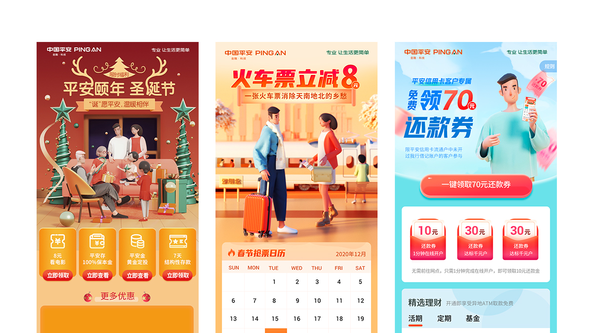 3D风格自从平安银行5.0设计开始,便一直在使用。也是近年的设计流行趋势。相比于 2D ,3D 设计的使用效率更高,也更符合年轻用户的喜爱。所以我们将所有2D人物形象3D化。