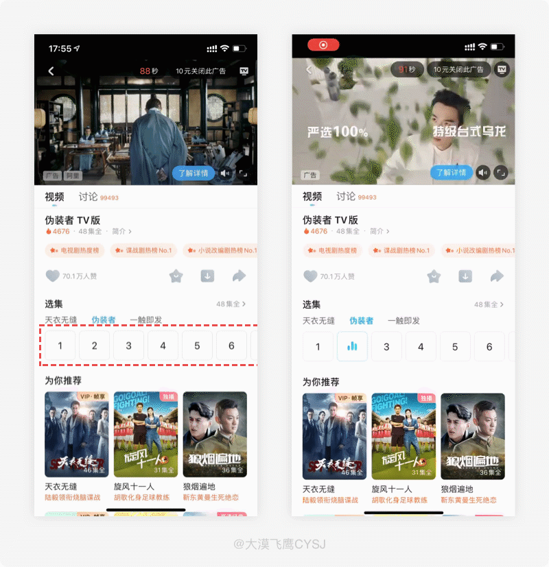 我们在用手机看电视剧时,其中有很多时候都是二刷回味,这时会在一部几十集的电视剧中反复点击集数按钮寻找自己记忆中想看的片段,或者通过加速的方式快速刷剧,此时如果能通过设计手段提升用户的操作、浏览效率,则会在一定程度上博得用户好感。