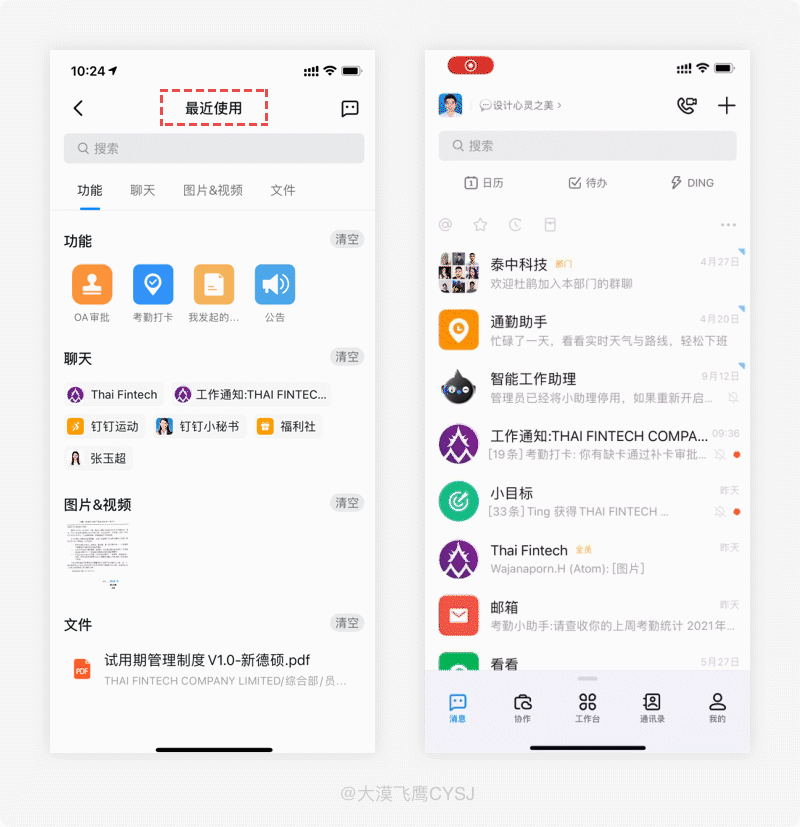 在钉钉首页进行“摇一摇”,会直接跳转至最近使用记录页面,且顶部有最近使用的功能、聊天、图片及文件等分类导航,如无需使用,可在我的-设置-效率套件中关闭此功能。