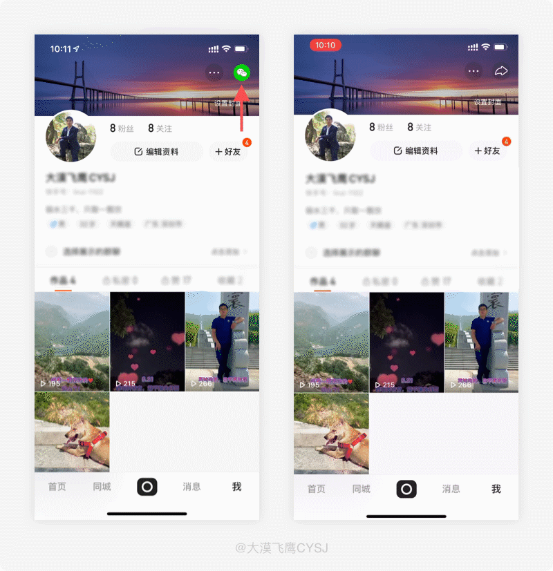 在快手我的、视频播放页面上方,分享图标会在几秒内自动变成微信图标并伴随动效闪动和文字提示,预示分享给微信好友。
